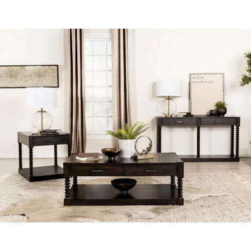 The table stands out with its spindle style legs and a plank-style tabletop surface, combining visual appeal and functionality, providing ample space for table lamps and decorative items