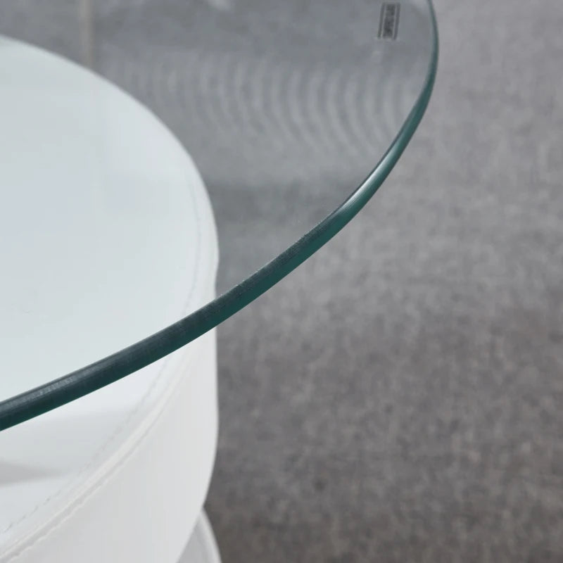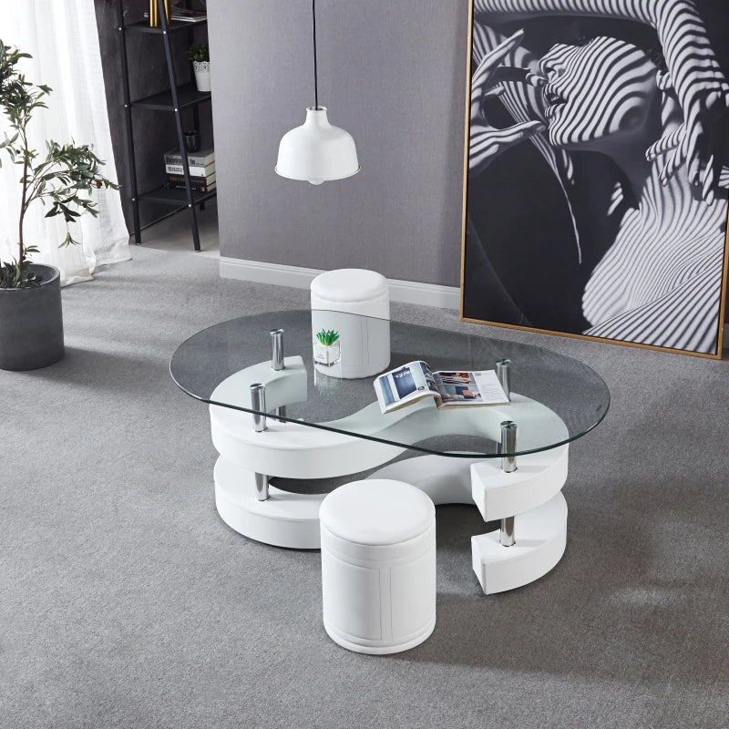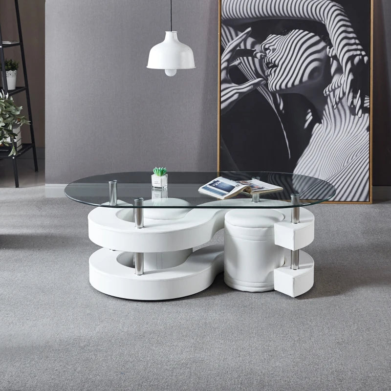3 Pieces Coffee Table Set, Oval 10mm/0.39" Thick Tempered Glass Table and 2 Leather Stools