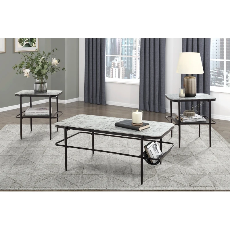 Enhance your living space with this stylish Martine 3-piece occasional table set. Featuring marble print tempered fluted glass tops, this set delivers both elegance and durability. The sleek black-finished metal base adds a contemporary touch, perfect for modern homes. Whether you're using it to showcase décor or as a functional surface, these tables provide versatility for your living room, office, or any space. Each table features shelves or side storage for magazines and remotes. Ideal for those seeking to blend chic aesthetics with practical design.