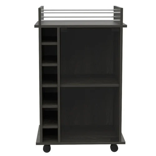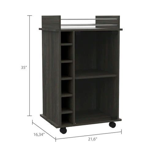 The three shelves provide versatile display and storage options, ideal for showcasing books, decor, or other items while keeping them easily accessible. The Espresso finish offers a deep, dark brown color with an almost black appearance, complemented by a glass door that adds elegance and transparency; the cabinet is designed to hold up to 6 bottles, making it perfect for organizing and displaying a moderate collection of wine or beverages.