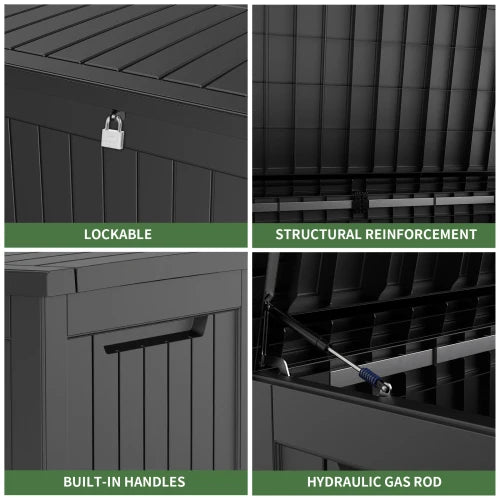 230-gallon outdoor storage box, you'll have a huge amount of storage space to hold more items. Whether it's family party supplies, camping gear, gardening tools, or children's toys, this extra large capacity storage box will meet your storage needs.