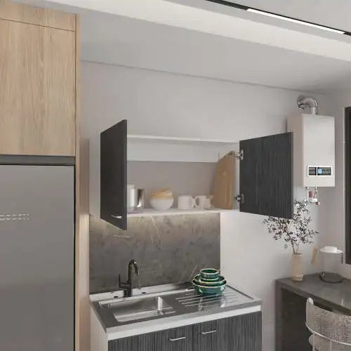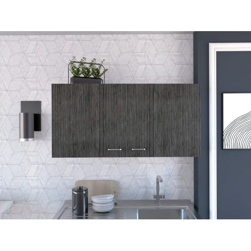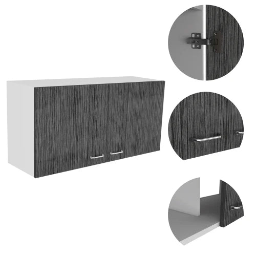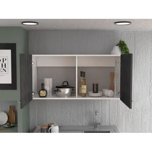 The cabinet combines a crisp white finish with a sophisticated smokey oak, offering a sleek, modern aesthetic. Designed as a wall-mounted unit, it provides efficient storage with two doors for easy access while maintaining a clean, organized appearance and a versatile, rectangular shape that fits seamlessly into various spaces.