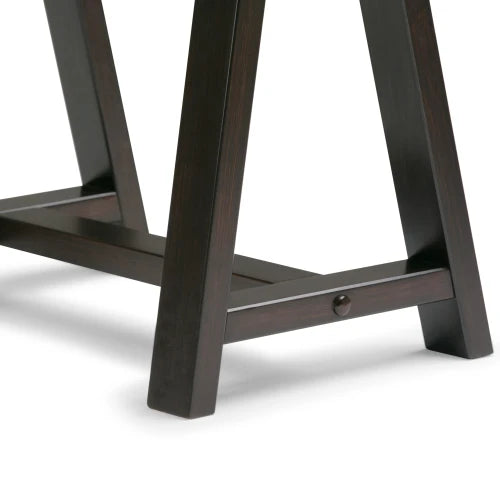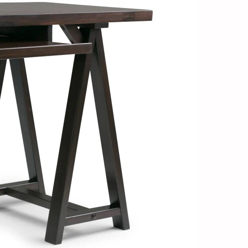 Features a simple and wide, extra thick table top surface, integrated wood keyboard tray and sturdy sawhorse supports