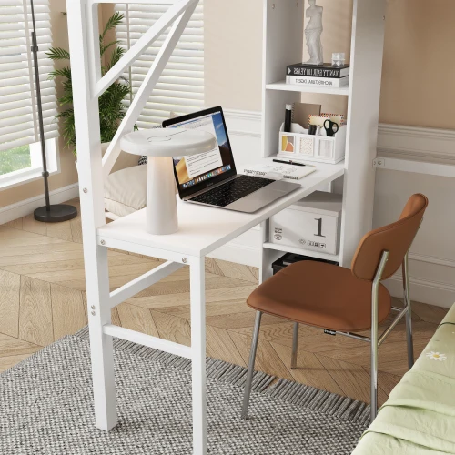 Study Station–A spacious desk under the full loft bed gives kids a quiet spot for homework or reading, while the four-tier side bookcase displays books, Decor or school supplies without taking extra floor space. The other side features a ladder included a hanging rod for clothes, towel etc make room more tidy.