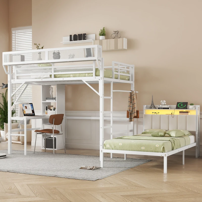 Double layered metal bed with desk and bookshelf, detachable metal bed with LED and charging station, white
