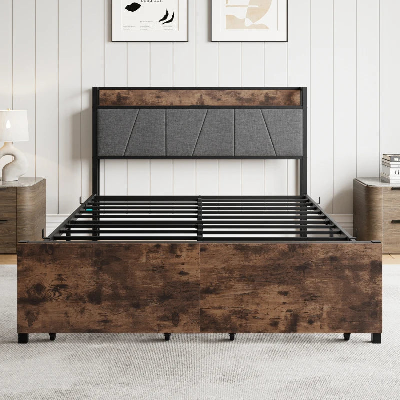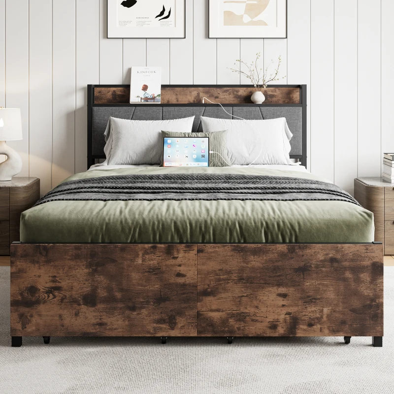 Full Size Bed Frame, Storage Headboard with Charging Station and 2 Storage Drawers,Vintage Brown and Gray
