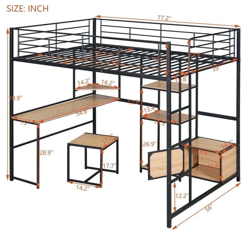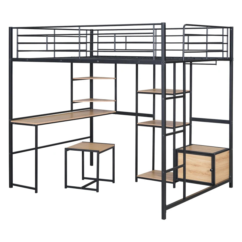 Full Size Loft Bed with Desk and Stool, Metal Loft Bed with Open-Style Wardrobe, Shelves and Cabinet