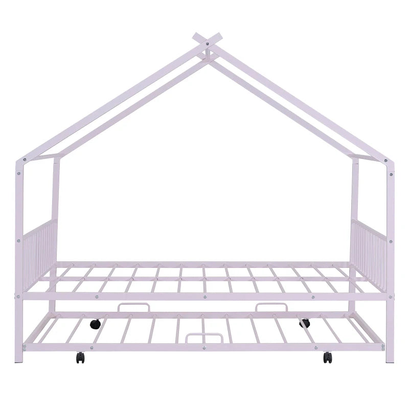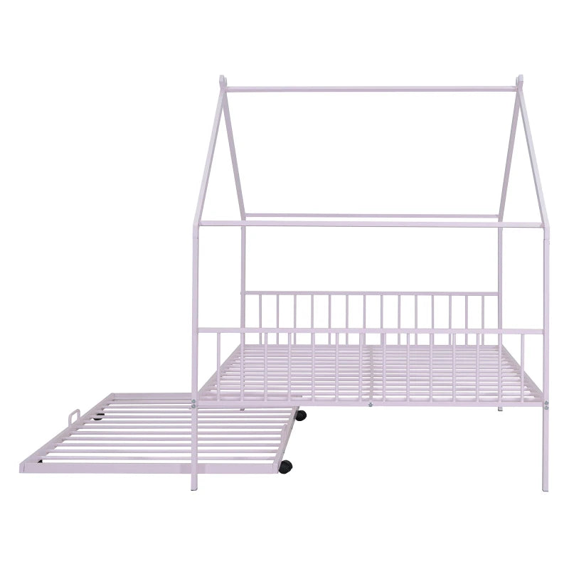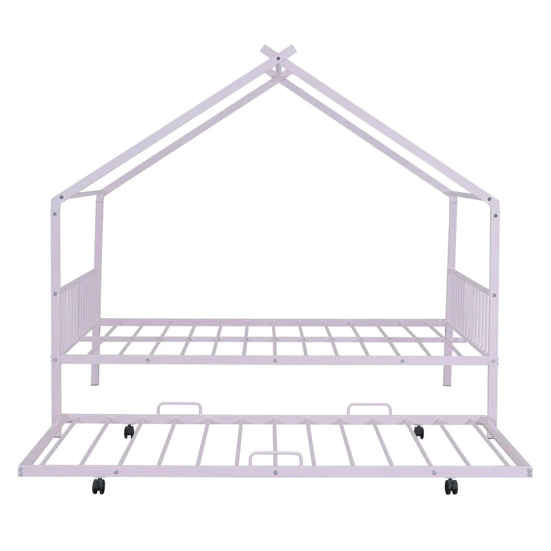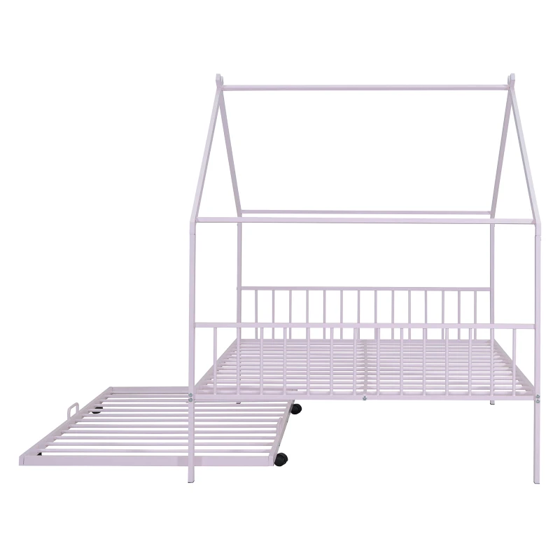 Full Size Metal House Bed with Twin Size Trundle, Pink