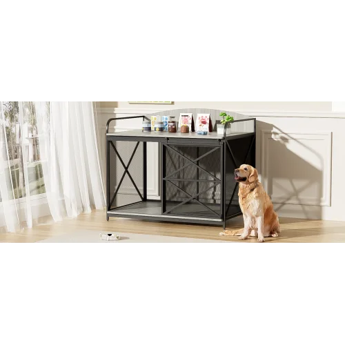 Sliding Door Design: The design of the sliding barn door makes it easier for dogs to get in and out, and is equipped with a lock for safety. When the space is small, you don't have to worry about the door of the dog cage not being able to open fully.