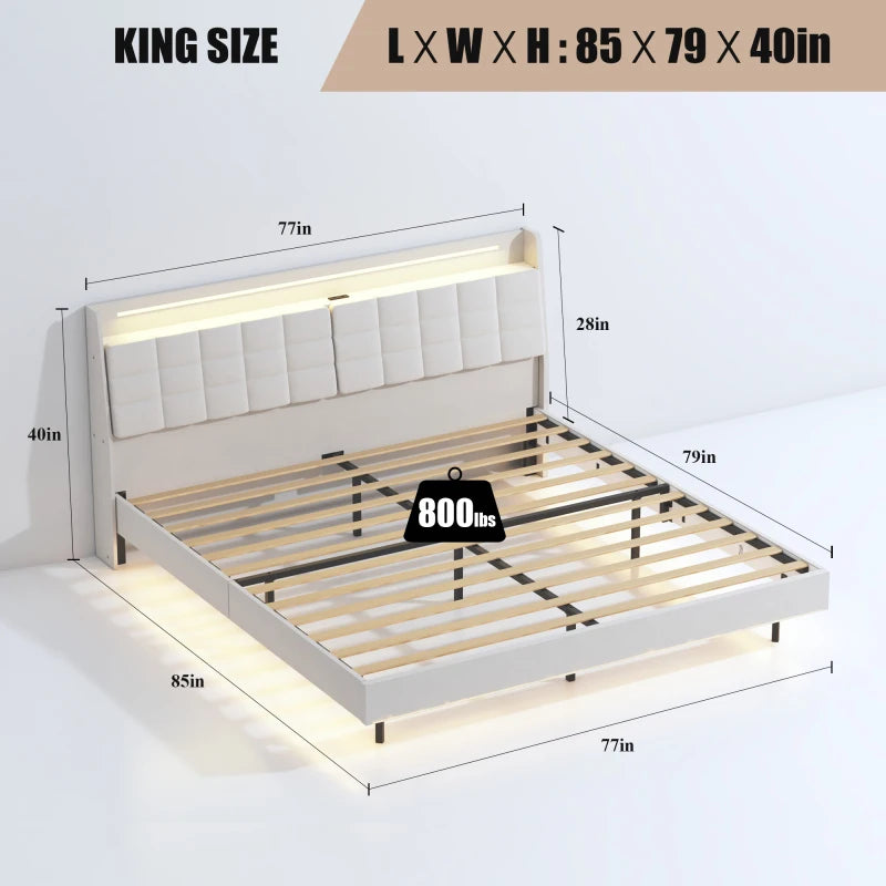 King Floating Bed Frame with LED Light and Charging Station Upholstered Platform Bed Frame King Size, No Box Spring Needed,Beige