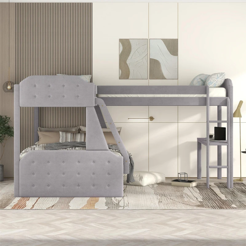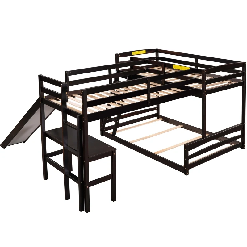 This l-shaped twin over full bunk bed with twin size loft bed is made of metal and medium density mdf board, which is fashionable and durable.It is very suitable for families with many family members or families with frequent guests staying overnight.The upper bunk is equipped with full-length guardrails, and the lower bunk is designed with headboards and pedals.This bunk bed ensures first-class safety for you.besides,built-in desk is convenient for you to learn and store things.and the attached slide is perfect for you to get fun.