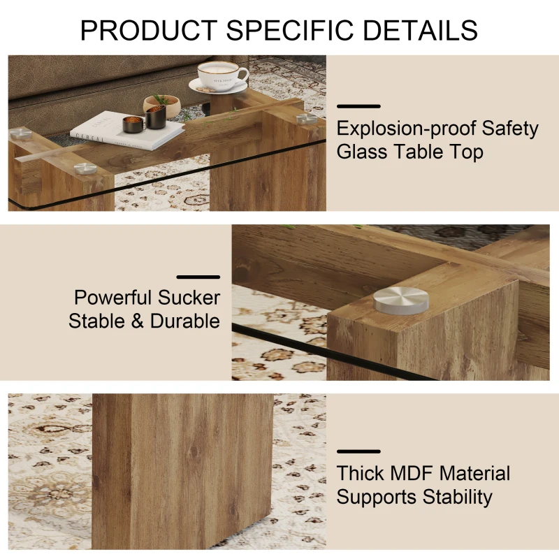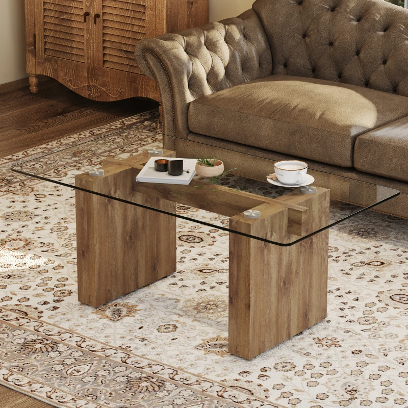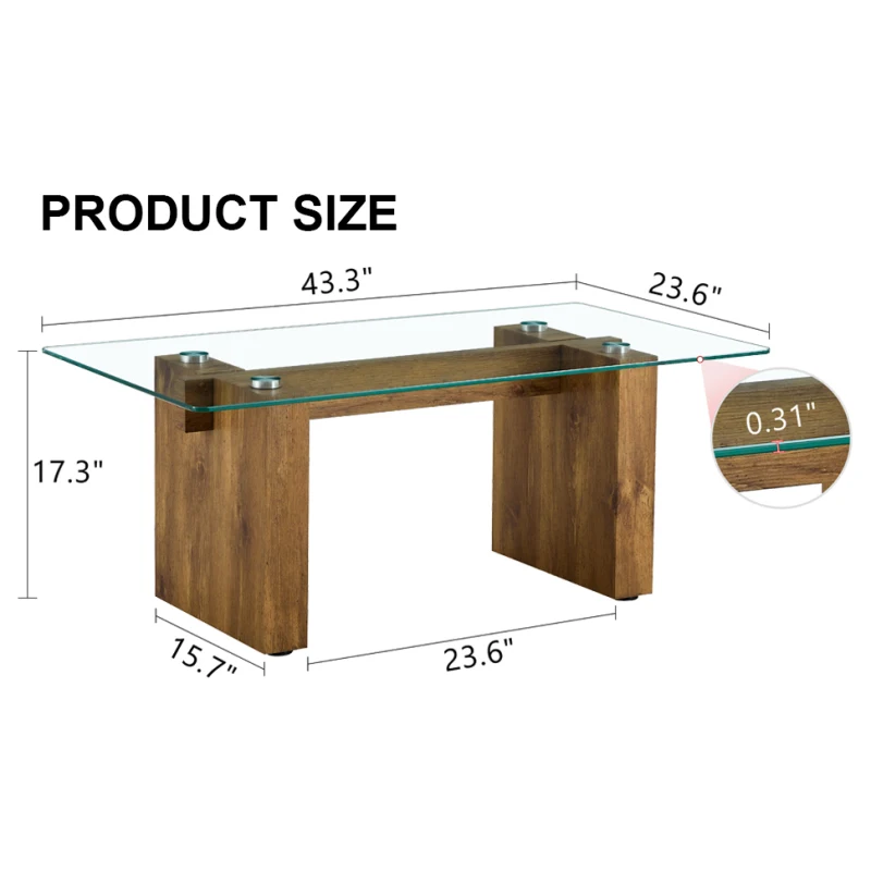 Modern minimalist transparent tempered glass coffee table and dining table, paired with wooden MDF decorative columns