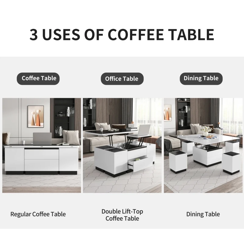 Modern White Lift Top Glass Coffee Table with Drawers & Storage Multifunction Table