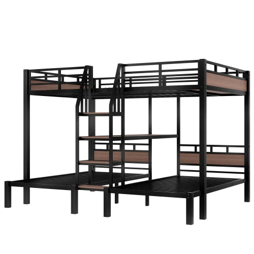 Queen over Twin over Twin metal bunk bed, a three-layer metal bunk bed with storage rack and storage staircase