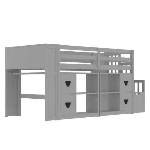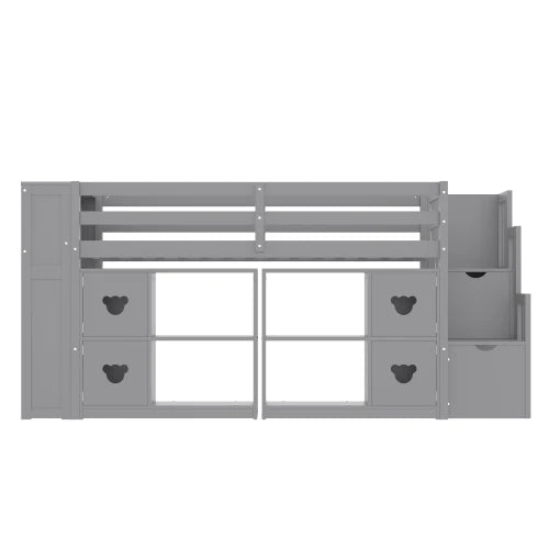 Twin low loft bed with shelves, storage headboard, and grey staircase
