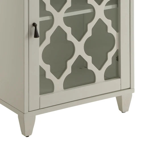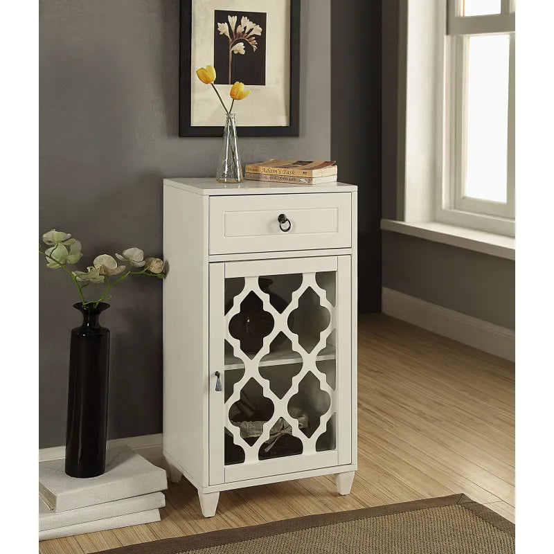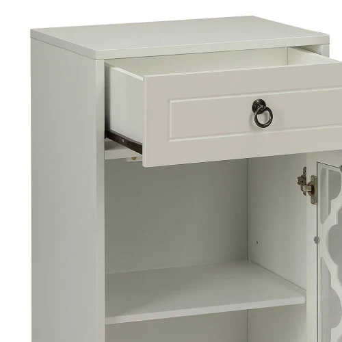 Ample Storage: Includes a drawer for small essentials and a glass door revealing an interior shelf for additional storage or display.