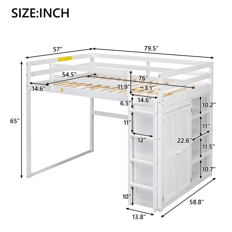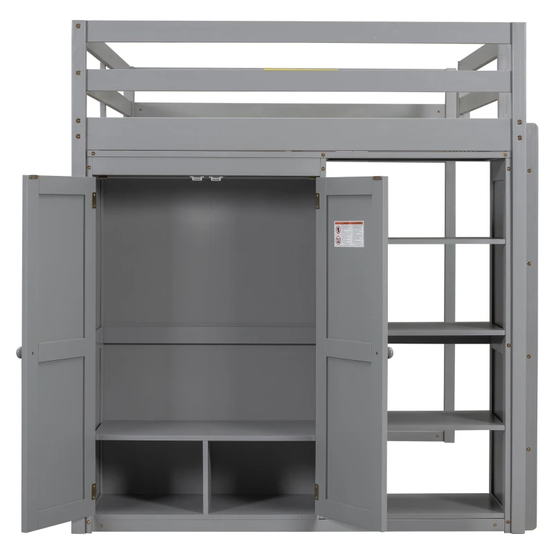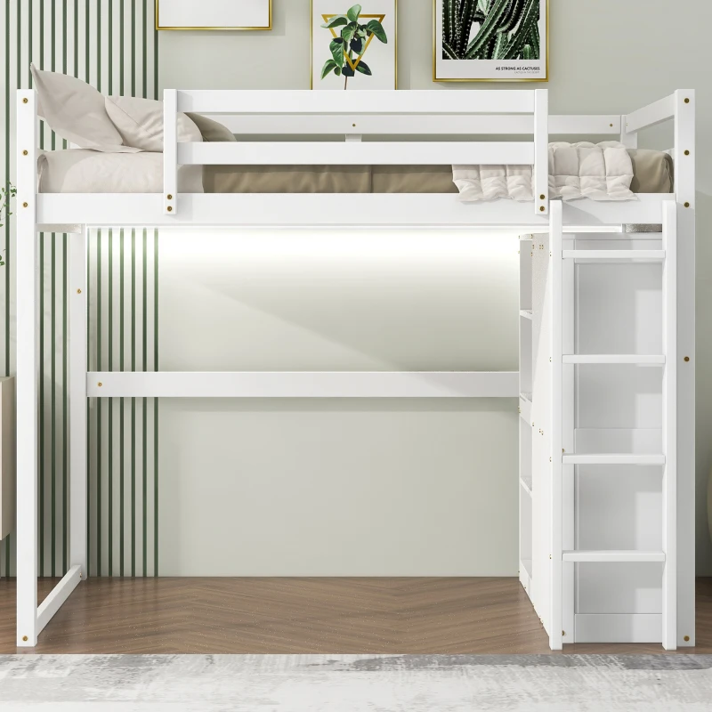 Wood Full Size Loft Bed with Built-in Wardrobe and Storage Shelves, Led light