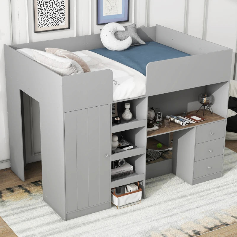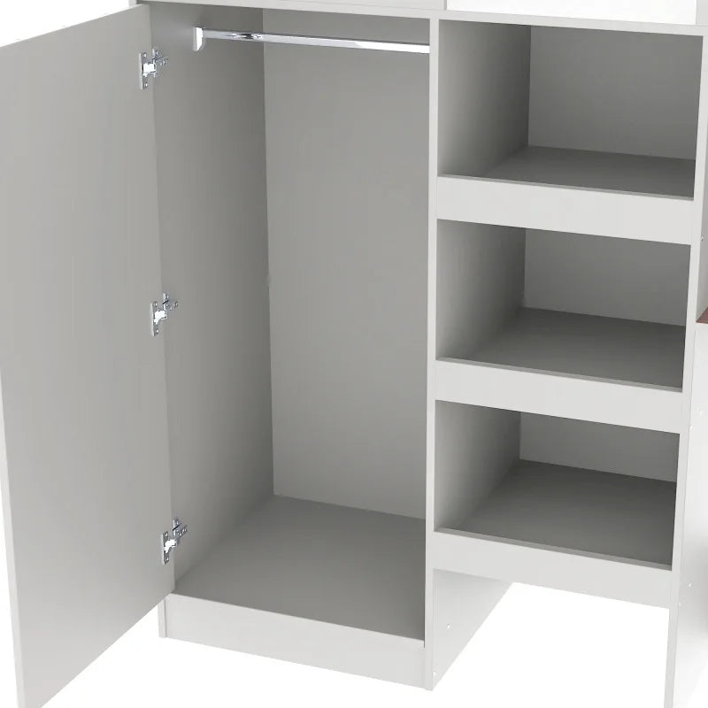 Wood Full Size Loft Bed with Built-in Wardrobe, Desk, Storage Shelves and Drawers