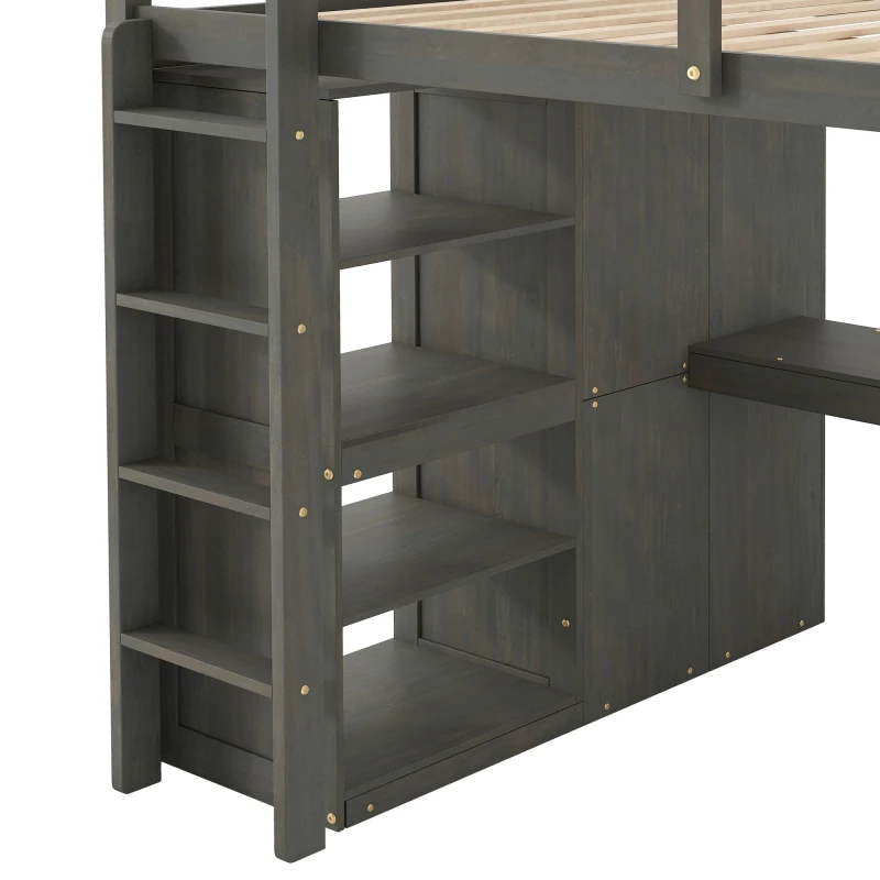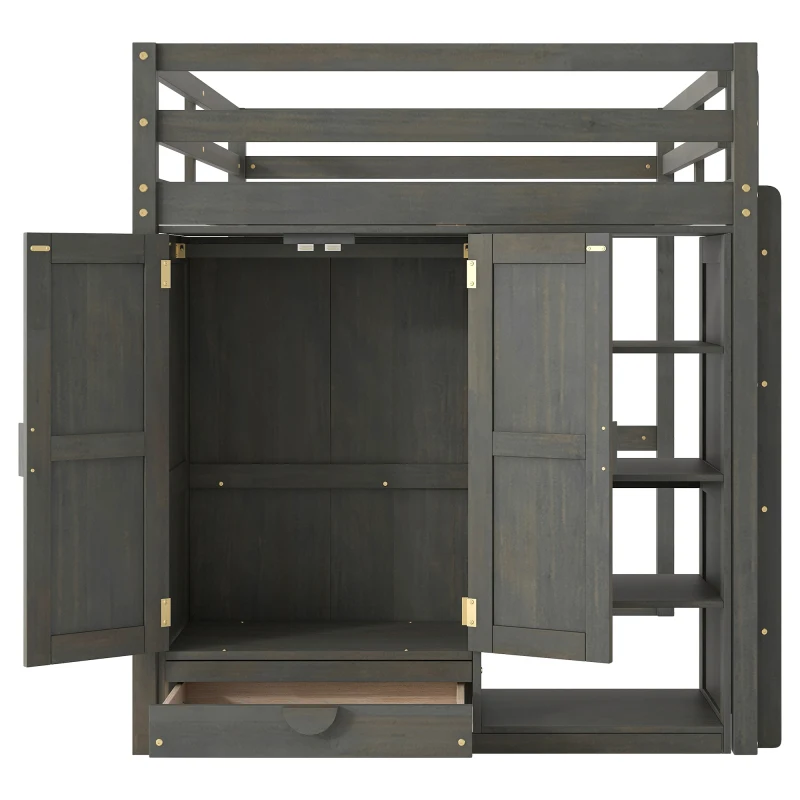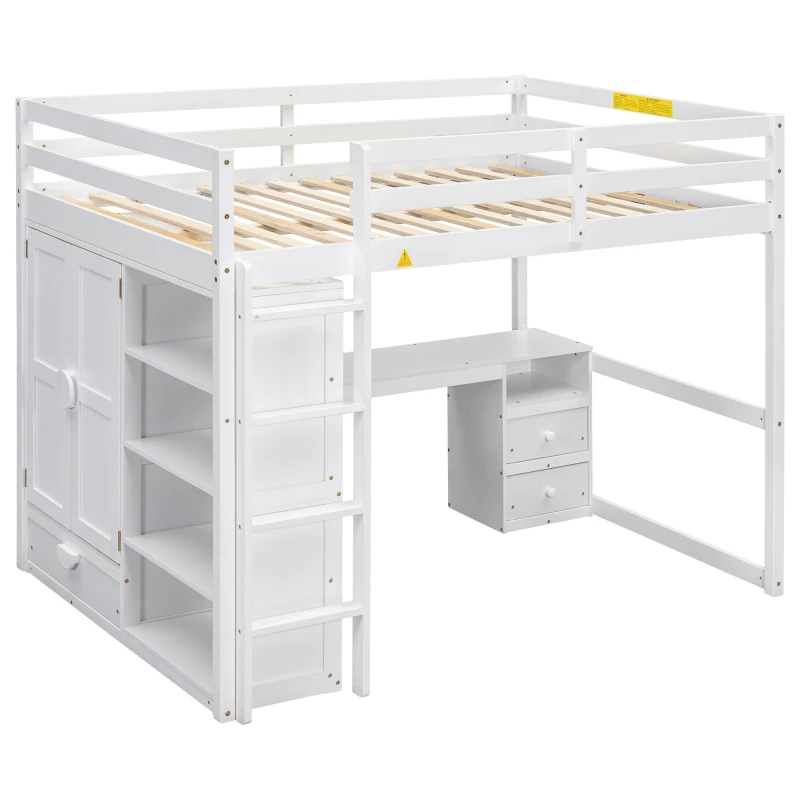Wood Full Size Loft Bed with Built-in Wardrobe, Desk, Storage Shelves and Drawers